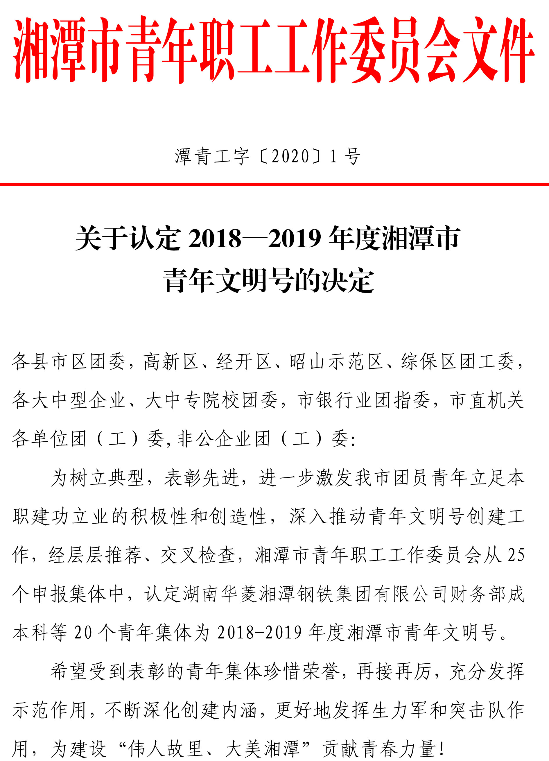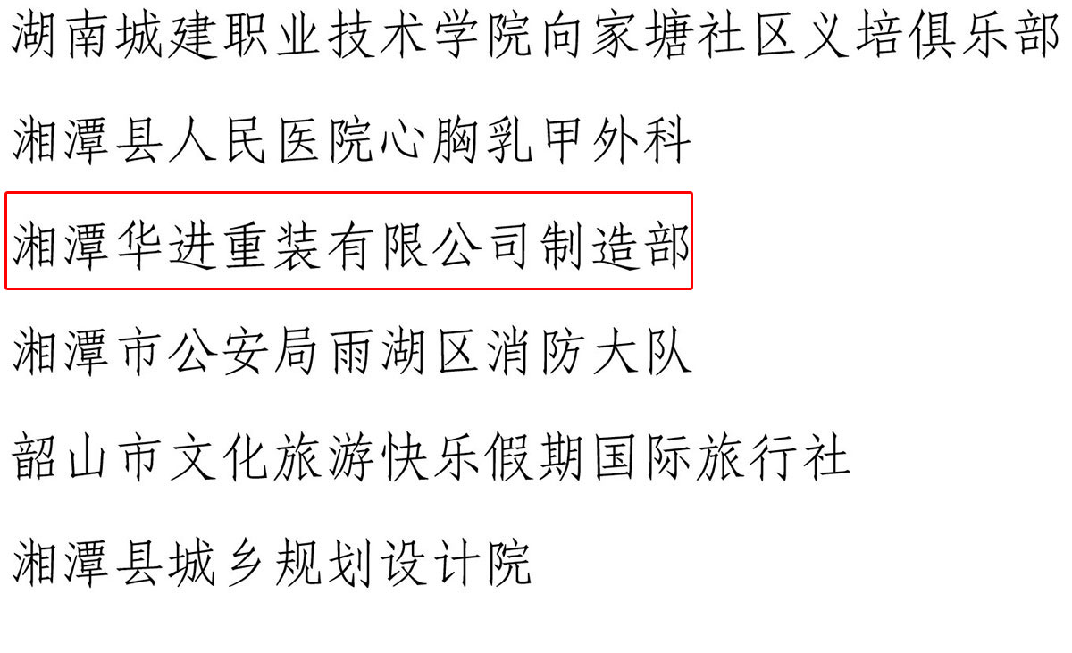 為樹立典型,表彰先進(jìn),進(jìn)一步激發(fā)湘潭市團(tuán)員青年立足本職建功立業(yè)的積極性和創(chuàng)造性,深入推動青年文明號創(chuàng)建工作,經(jīng)層層推薦、交叉檢查,湘潭市青年職工工作委員會從 25個申報集體中,認(rèn)定湘潭華進(jìn)重裝有限公司制造部等 20 個青年集體為 2018-2019 年度湘潭市青年文明號。