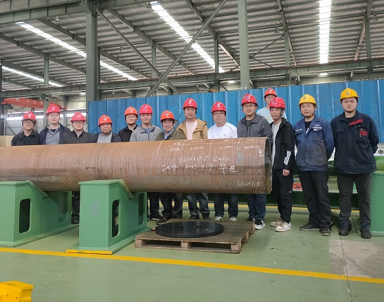? ? 2023年4月6-9日,中油寶世順(秦皇島)鋼管有限公司(以下簡(jiǎn)稱(chēng)“寶世順公司”)擴(kuò)徑機(jī)項(xiàng)目組成員對(duì)華進(jìn)公司制作的新能源管材生產(chǎn)線全長(zhǎng)擴(kuò)徑機(jī)組進(jìn)行預(yù)驗(yàn)收。寶世順公司項(xiàng)目組一行首先對(duì)供貨設(shè)備外觀進(jìn)行查驗(yàn),其次,按照供貨明細(xì)進(jìn)行盤(pán)查清點(diǎn),最后在設(shè)備裝配現(xiàn)場(chǎng),使用該臺(tái)設(shè)備對(duì)直縫焊管(型號(hào):直徑610mm,長(zhǎng)度12.5米)進(jìn)行分步擴(kuò)徑。在預(yù)驗(yàn)收總結(jié)會(huì)上,寶世順公司項(xiàng)目組成員對(duì)華進(jìn)公司制作的設(shè)備給予高度評(píng)價(jià),最終得出結(jié)論為全長(zhǎng)擴(kuò)徑機(jī)組的外觀、性能均符合預(yù)驗(yàn)收的標(biāo)準(zhǔn)。