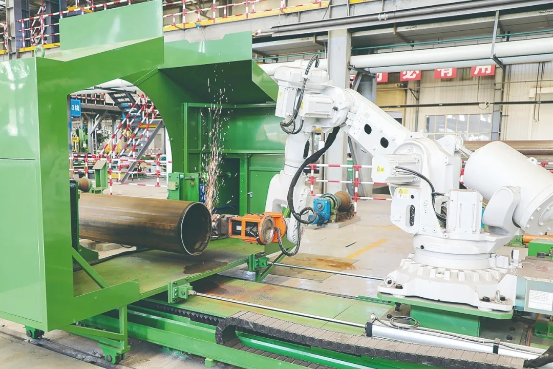 新能源管材生產(chǎn)線機(jī)器人正在修磨直縫管管端焊縫。通訊員 李少波 攝
